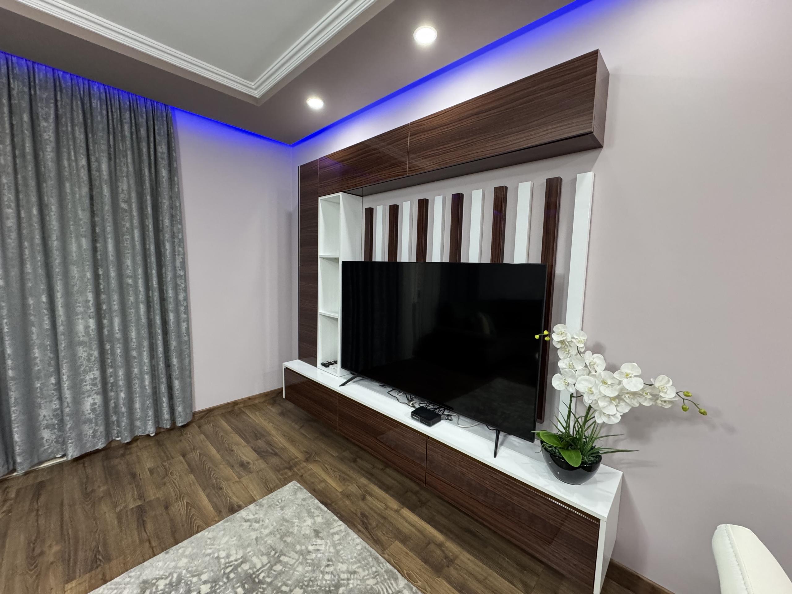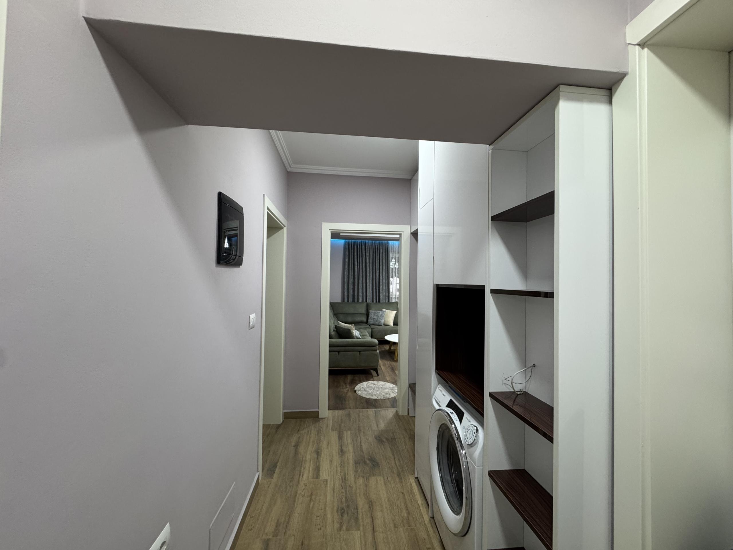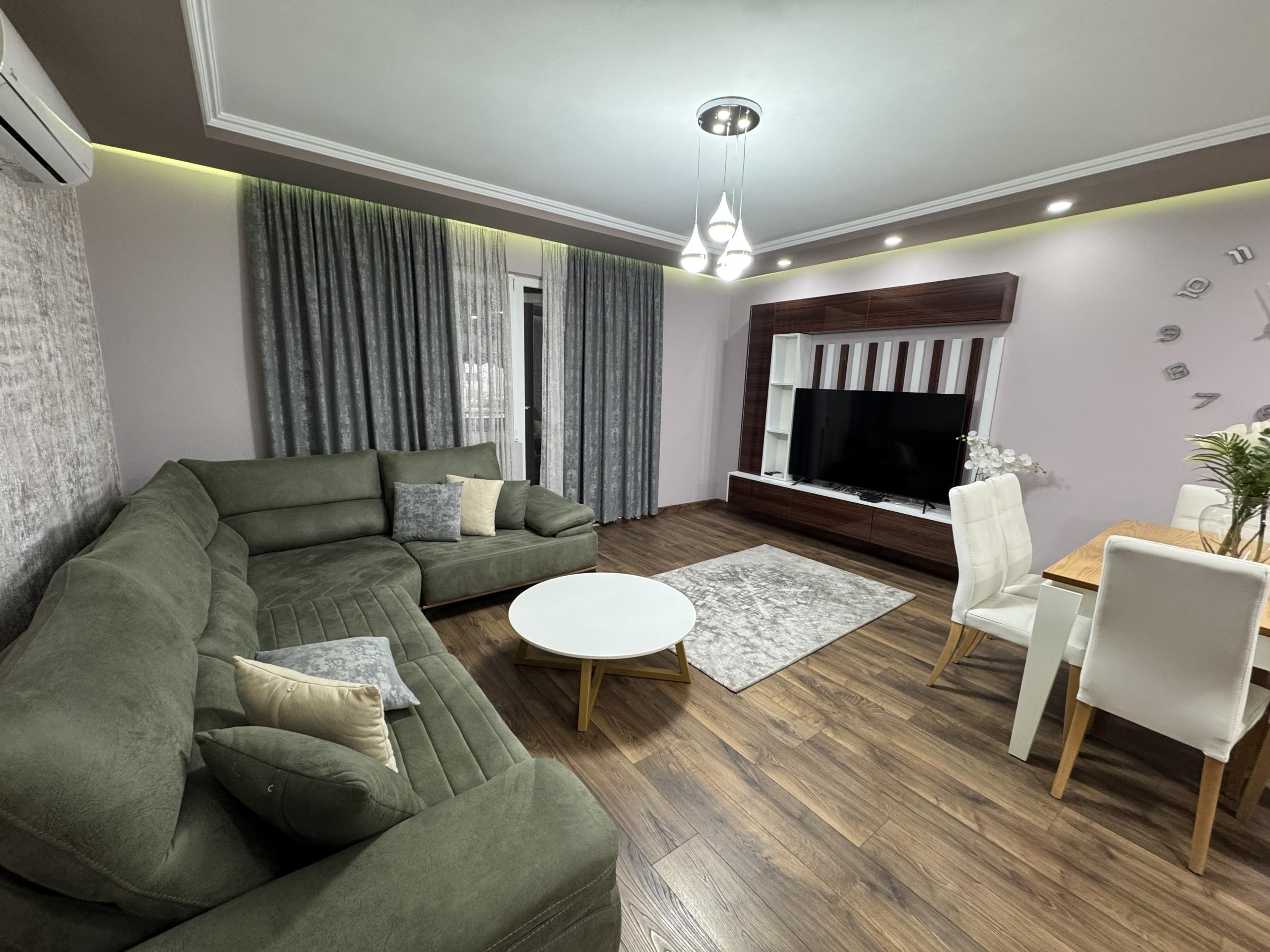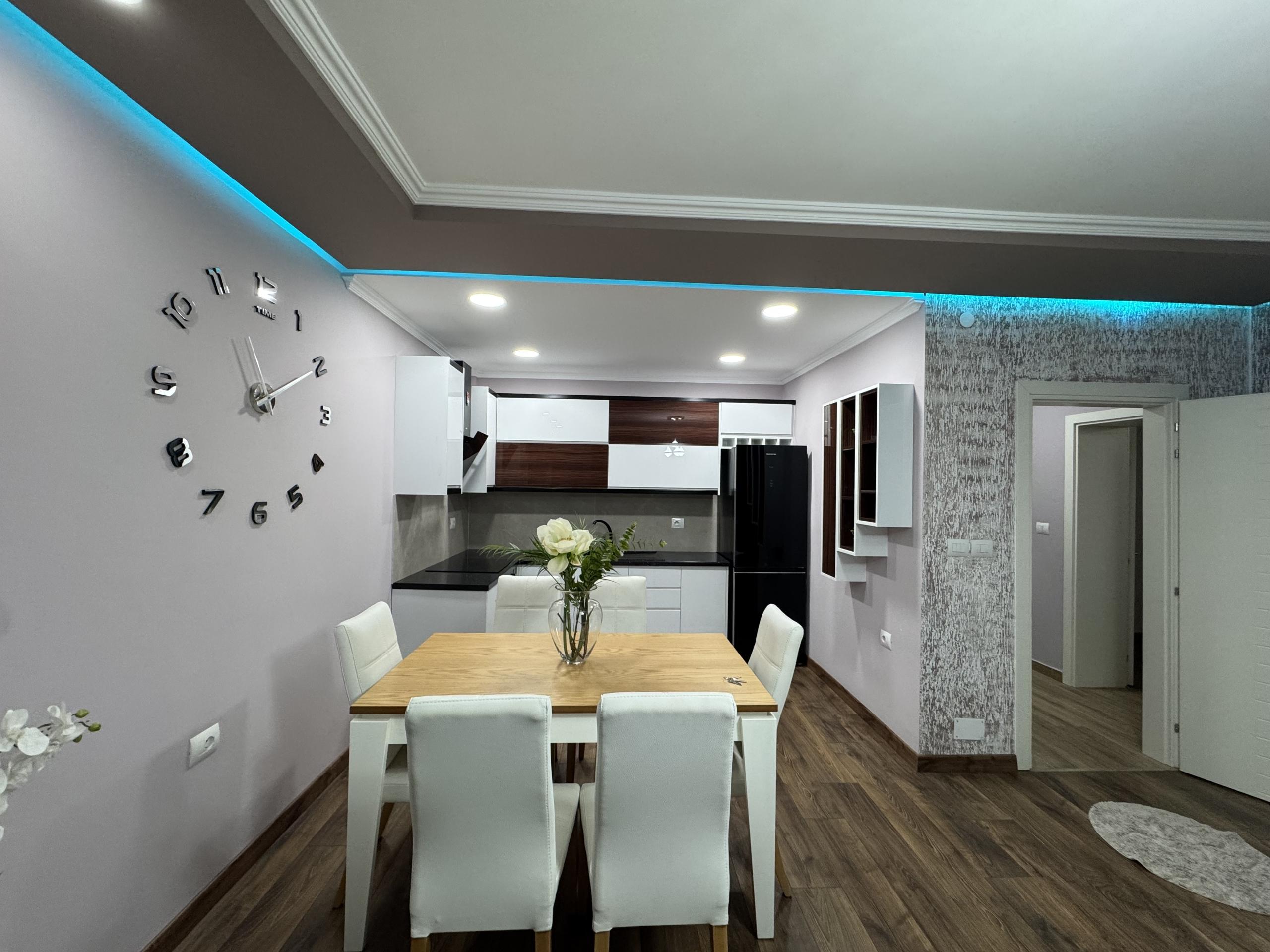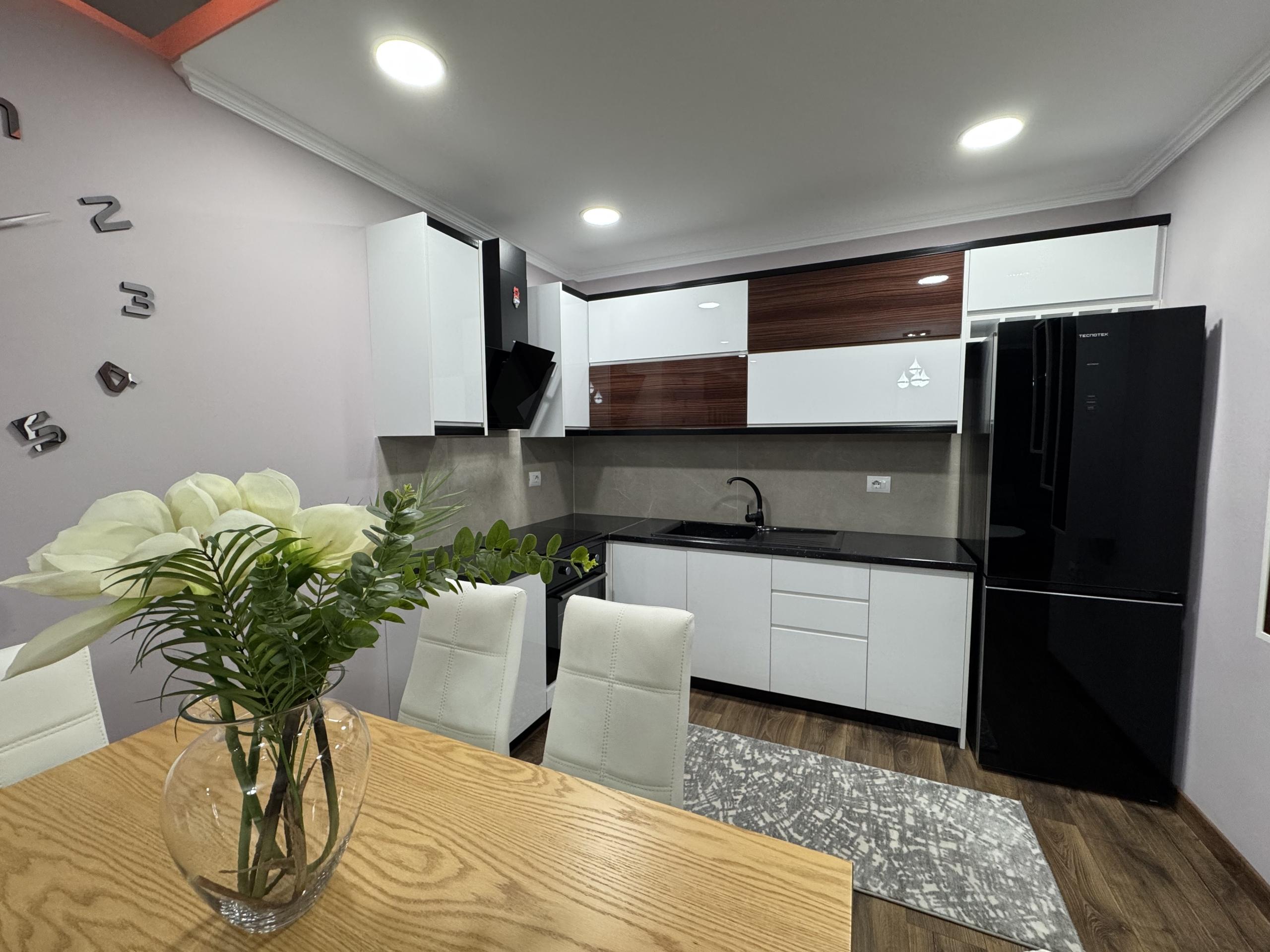 Ka siperfaqe 100 m2 dhe organizim ne kuzhine me ambjent gatimi 2 dhoma gjumi tualet dhe ballkon i madh.