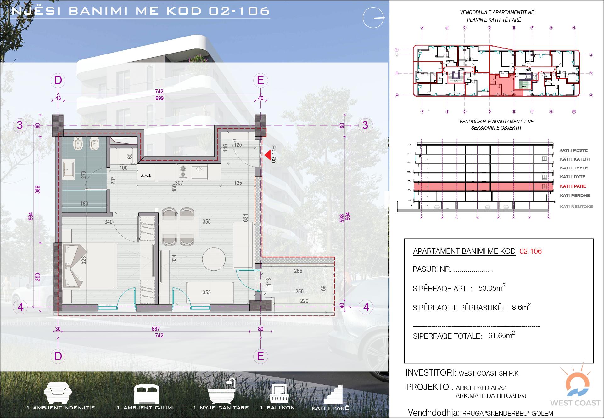 Tipologjia: Apartament 1+1 (Një dhomë gjumi, Sallon + Kuzhinë, Banjo, Ballkon).